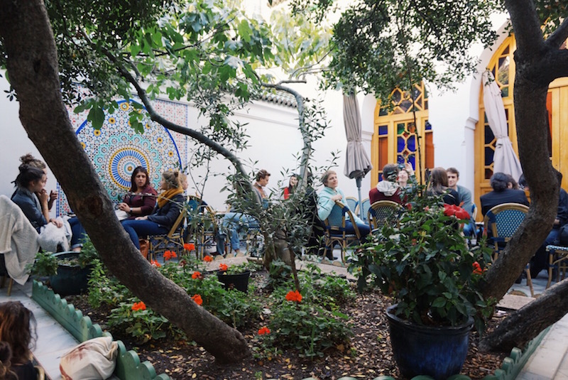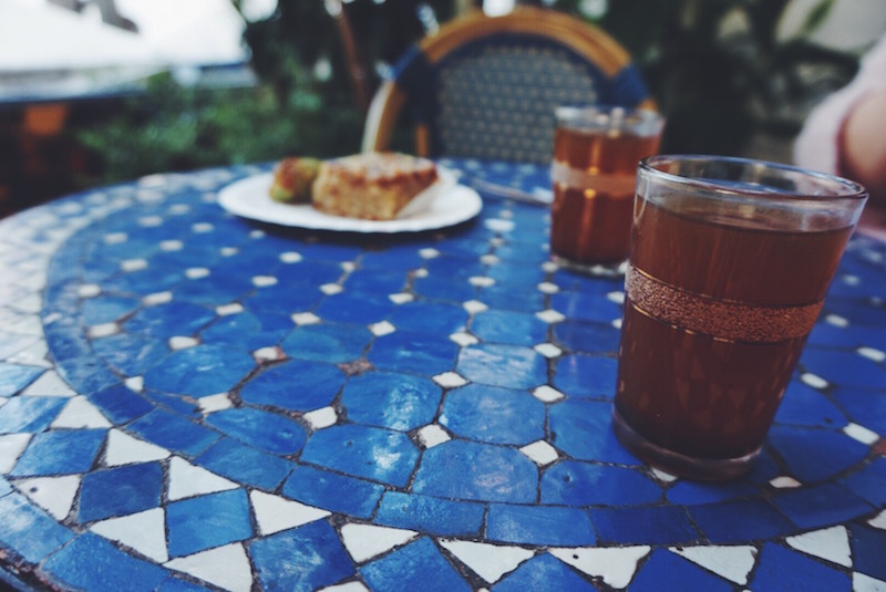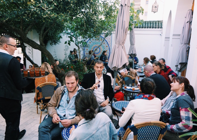 Von außen ist das Gebäude eher unscheinbar und man vermutet eher weniger eine orientalische Oase hinter den Mauern. Doch betritt man den kleinen Innenhof, so ändert sich die Wahrnehmung schlagartig. Bunte Mosaiktische auf unterschiedlichen Ebenen vor weiß verputzten Wänden, die weitere Mosaike schmücken, umringt von grünen Pflanzen. Ein süßlicher Geruch liegt in der Luft und die Uhren scheinen plötzlich langsamer zu ticken. Steigt man die wenigen Stufen zum Eingang hinauf, so sieht man bereits die Theke mit den unterschiedlichen Köstlichkeiten, die hier angeboten werden. Unterschiedlichste Gebäcke und Kuchen mit Pistazien, Mandeln und meist von einer dicken Zuckerschicht überzogen. Von dort aus geht es rechts in das gemütliche Restaurant, wo orientalische Speisen wie unterschiedliche Gerichte mit Couscous serviert werden.