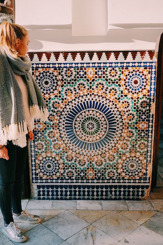 Nachdem wir nun gestärkt waren, machten wir uns auf, die Moschee nun auch endlich zu besichtigen. Dafür verließen wir die Teestubenidylle und erreichten wenig später den Haupteingang. Etwas seltsam fühlte es sich an, an dem bewaffneten Wächter vorbei, die Moschee zu betreten. Unmittelbar hinter dem Eingang verbirgt sich ein wunderschöner Garten mit Brunnen, schmalen Wegen und weiteren Mosaiksteinen verzierten Mauern. Der Eintritt in die Gebetsräume kostet 3€ pro Person. Im Inneren ist ebenfalls alles mit den kleinen bunten Steinen verziert, es ist hell und durch kleine Fenster hat man einen beeindruckenden Ausblick auf den Innenhof samt Garten.