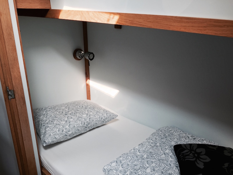 Die Küche samt Wohn-/Essbereich war total einladend und auch die Kajüten waren wahnsinnig bequem. Das Schiff beinhaltet eine Einrichtung für 16 Gäste über Nacht, für Tagesausflüge finden fast 30 Personen dort Platz. Die Kajüten sind immer für zwei Personen und haben gemütliche Betten mit einer Leselampe, einer Heizung, einem Bullauge und einer Dachluke. In den meisten Kajüten waren die Betten übereinander angeordnet.