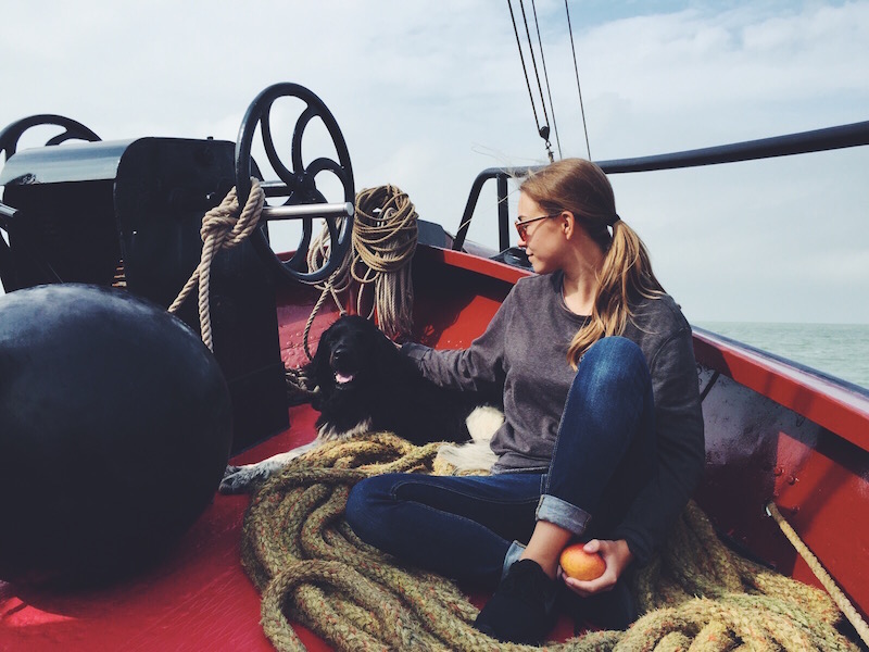 Unser Boot trug den Namen Zwarte Valk. Ursprünglich handelte es sich bei dem heutigen Passagierschiff um ein Frachtschiff aus dem Jahre 1889. Erst 2008 wurde es umgebaut und erweist seitdem Schulklassen, Junggesellenabschieden, Vereinsfahrten, Betriebsausflügen und vielem mehr als Passagiersegelschiff seine Dienste. Unsere Skipperin Jantine samt Schiffshund Joris und ihre erfahrene Matrosin hießen uns herzlich willkommen an Bord und gaben uns die ersten Anweisungen. Für die einen völlig neu, für die anderen lediglich als Wissensauffrischung dienend, erklärten sie uns einige Grundbegriffe, Knotentechniken und die generelle Aufteilung des Bootes. Ich hätte mir das Innere des Bootes viel kleiner und ungemütlicher vorgestellt.