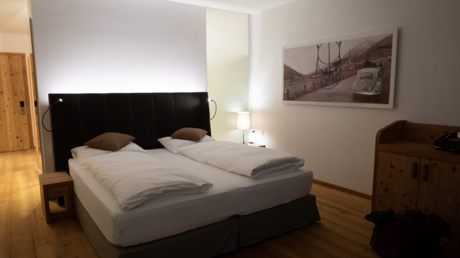 Sowohl die Zimmer-, als auch die weitere Einrichtung des Hotels ist modern, aber gleichzeitig gemütlich gehalten. Die Möbel sind aus Lärchen- und Zirbelholz aus der Umgebung gefertigt. Von unserem lichtdurchfluteten Zimmer und sogar aus den bequemen Betten hatten wir eine wunderschöne Aussicht auf das Bergpanorama.